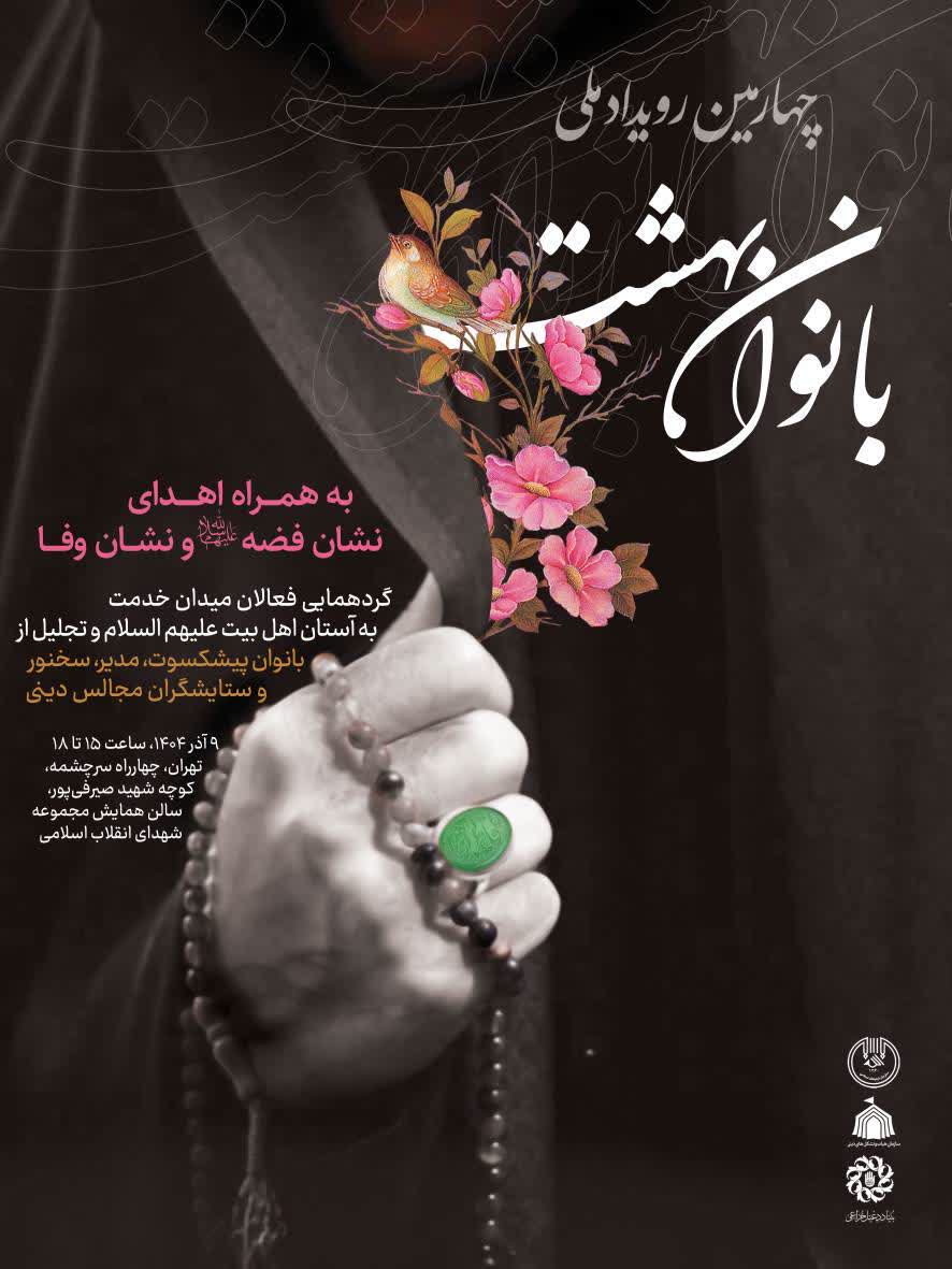 شایانذکر است چهارمین رویداد ملی بانوان بهشت، با اهدای نشان «فضه» و «وفا» در تهران 9 آذرماه 1404 در سالن همایشهای مجموعه فرهنگی شهدای انقلاب اسلامی (سرچشمه) برگزار میشود و پسازآن در تمام استانهای کشور از بانوان فعال عرصه خدمت به اهلبیت (ع) در قالب این طرح تجلیل و تکریم خواهد شد.