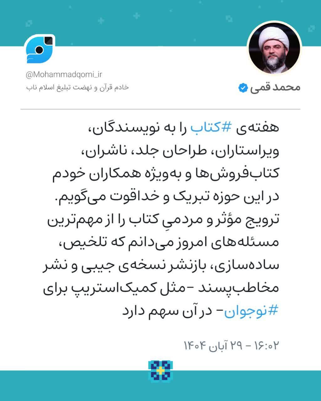 به گزارش روابط عمومی سازمان تبلیغات اسلامی، حجت‌الاسلام محمد قمی، رئیس سازمان تبلیغات اسلامی به مناسبت هفته کتاب در صفحه شخصی خود در شبکه اجتماعی ویراستی نوشت؛