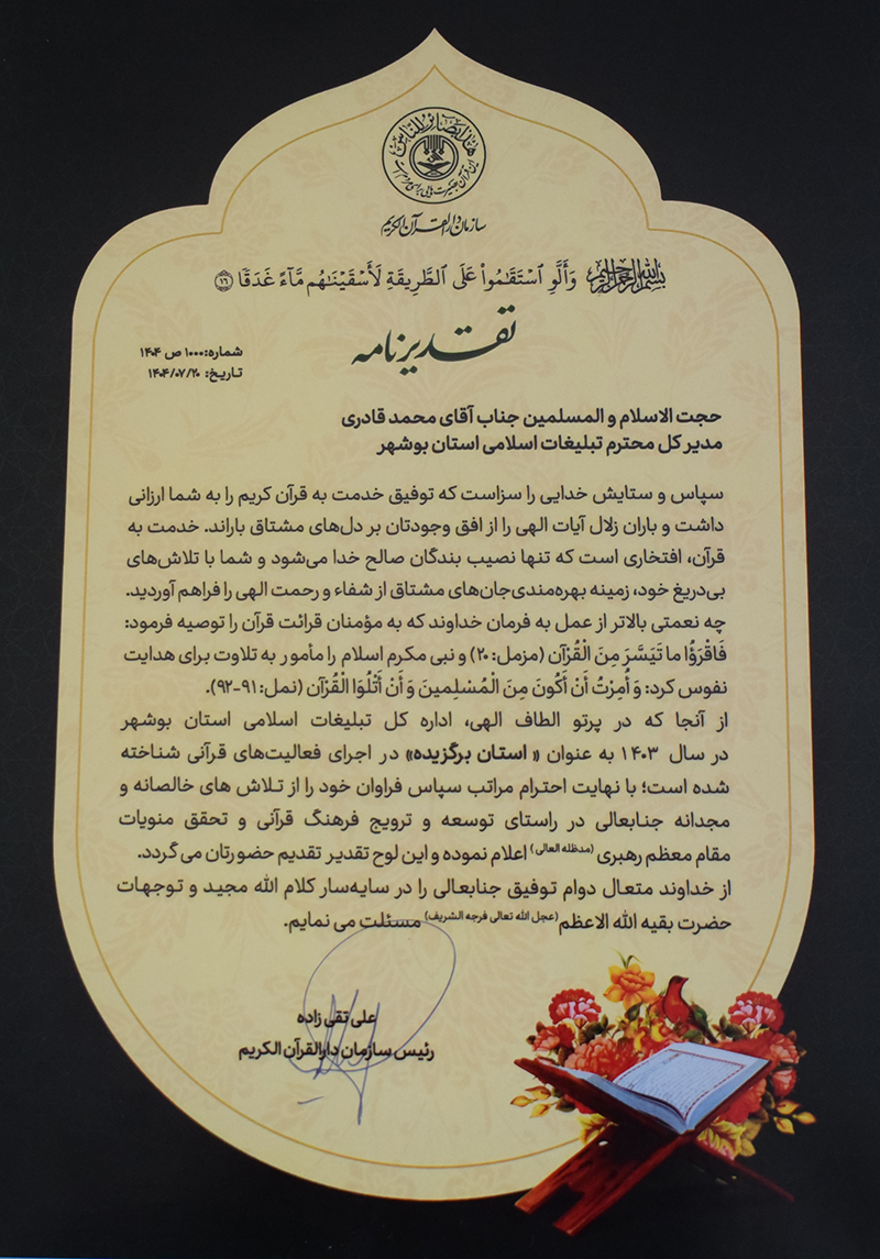 در متن لوح تقدیر خطاب به مدیرکل تبلیغات اسلامی بوشهر آمده است: «ادارهکل تبلیغات اسلامی استان با تلاشهای خالصانه در مسیر توسعه و ترویج فرهنگ نورانی قرآن کریم و تحقق منویات مقام معظم رهبری (مدّظلّهالعالی)، در سال ۱۴۰۳ به عنوان استان برگزیده در اجرای فعالیتهای قرآنی شناخته شده است؛ مراتب سپاس و قدردانی از زحمات جنابعالی و آن مجموعه اعلام و این لوح تقدیر تقدیم میشود.»