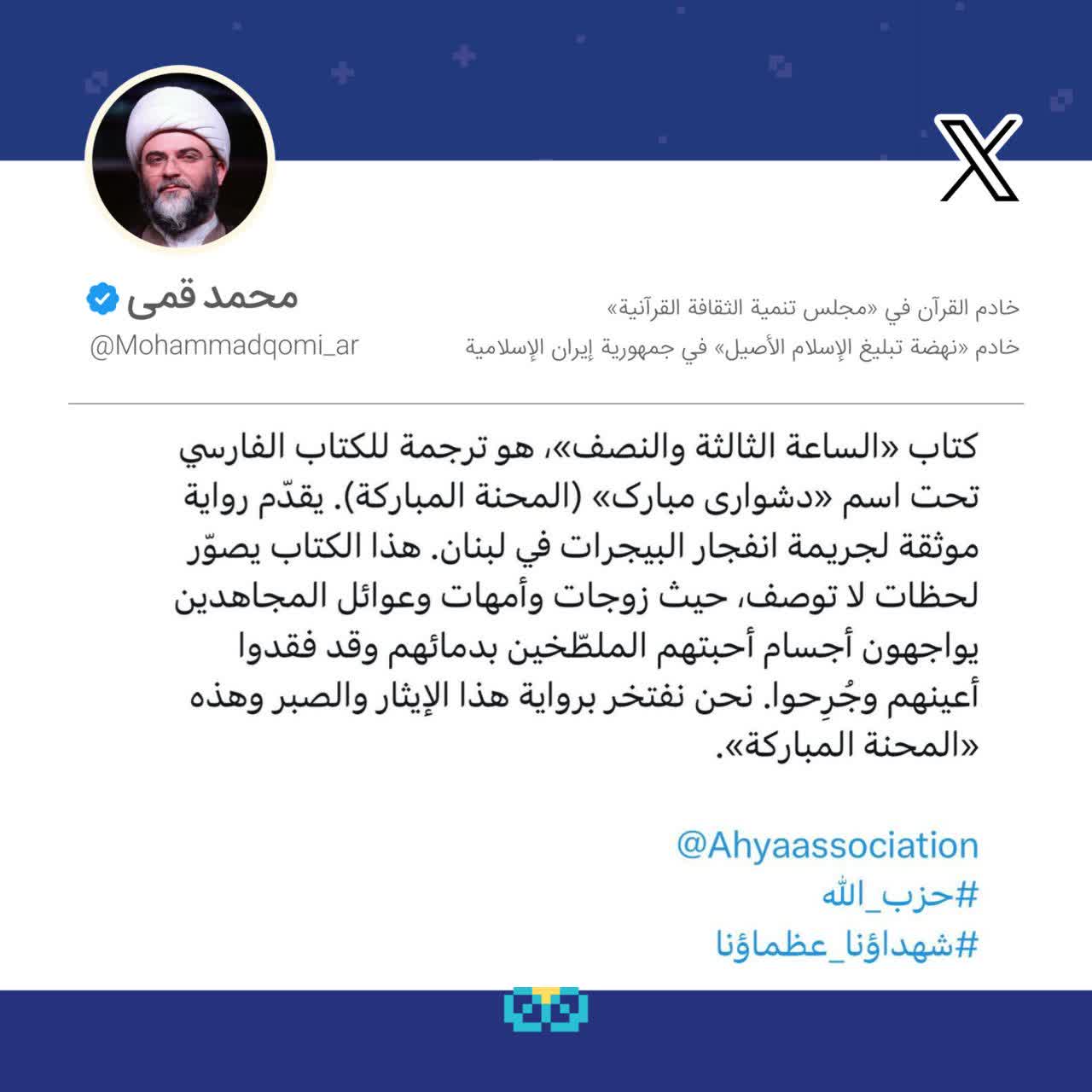 به گزارش روابط عمومی سازمان تبلیغات اسلامی، حجتالاسلام محمد قمی، رئیس سازمان تبلیغات اسلامی در صفحه شخصی خود در شبکه اجتماعی ایکس ویژه مخاطبان عرب زبان پس از انتشار ترجمهی عربی کتاب دشواری مبارک، نوشتهی خانم فائضه غفار حدادی و محصول انتشارات سوره مهر، که روایت استقامت و صبوری خانوادهها، همسران و مادران شهدا و جانبازان جنایت انفجار پیجرها در لبنان است نوشت؛